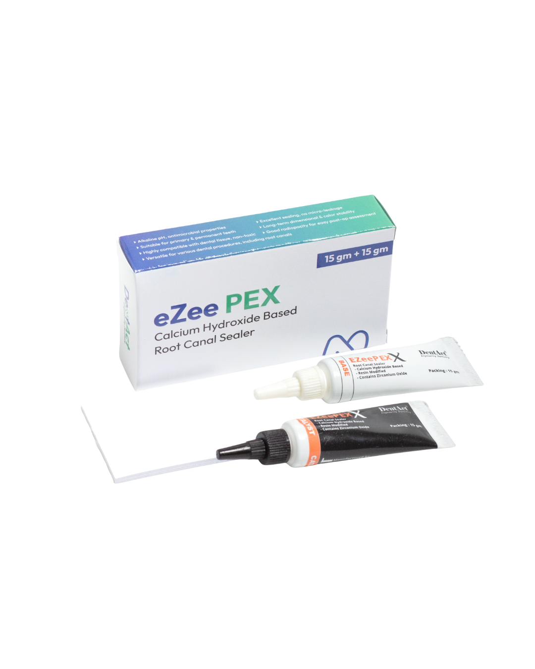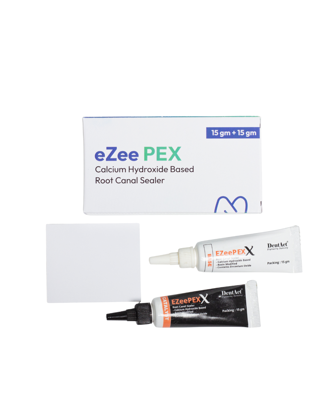 eZeePEX is Resin bonded Calcium Hydroxide based root canal sealing material. It is supplied in a two paste form. It is provided with very low or no solubility and because of that it reduces the risk of leakage of the canal. It is radio opaque with noticeable radiographs on X-rays. It can be used for permanent sealing of the root canal. It is insoluble in water, non-degradable and does not requires Eugenol for setting. It is an Epoxy Resin based composite material specially formulated to fulfilment of all basic needs of sealing applications in endodontics. During setting at normal temperature the shrinkage will be minimum which is one of the best feature it is having. The Powder contain a significant amount of mineral tri-aggregates which enables excellent post RCT healing and slightly expands so it seals flawlessly.